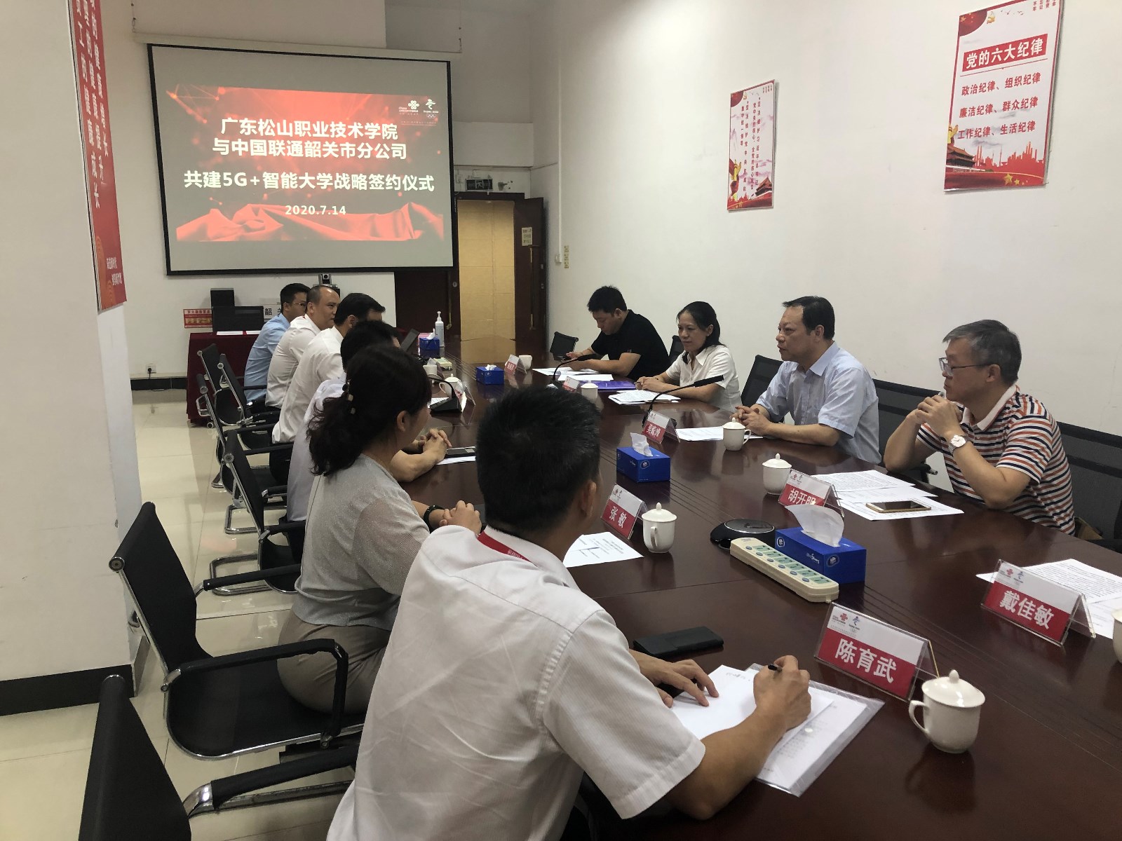 7月14日下午,我校与中国联通公司韶关市分公司“5G智能大学”战略合作签约仪式在中国联通韶关市分公司会议室举行。学校校长吴奇峰、校企合作中心主任王修琼、信息中心主任胡开明、科技服务中心主任朱海洋,中国联通公司韶关市分公司党委书记、总经理彭文标,副总经理喻凌阳等出席签约仪式。