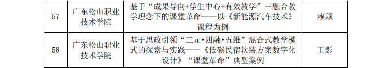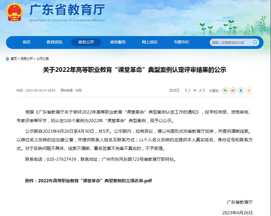 4月26日,广东省教育厅发布了《关于2022年高等职业教育“课堂革命”典型案例认定评审结果的公示》,我校赖颖教师的案例《基于“成果导向+学生中心+有效教学”三融合教学理念下的课堂革命——以〈新能源汽车技术〉课程为例》与王影教师的案例《基于思政引领“三元•四融•五维”混合式教学模式的探索与实践——〈低碳民宿软装方案数字化设计〉“课堂革命”典型案例》获得认定,实现了我校省级“课堂革命”典型案例零的突破。