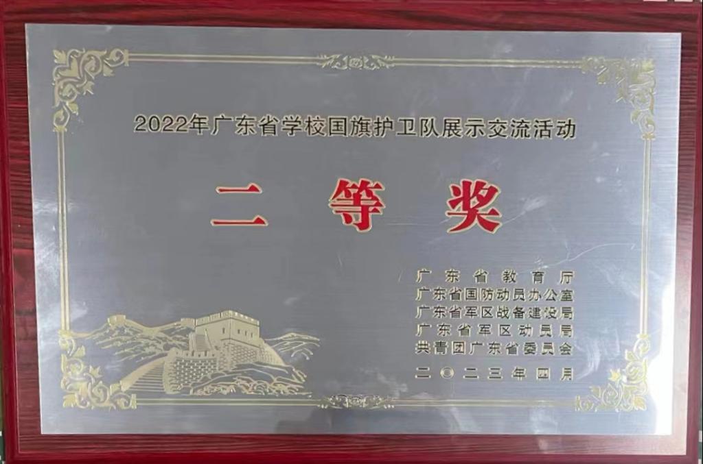 我校国旗护卫队自2020年1月成立至今,已圆满执行了153次升旗任务。2021年12月,我校国旗护卫队在接到国旗护卫队比赛通知后,积极投身到训练中。队员利用假日、晚上等空闲时间,出色完成了训练任务。在第一阶段的公开展播遴选中,我校国旗护卫队的参赛视频以优异的成绩顺利进入决赛。2022年的决赛因疫情原因推迟至2023年4月进行,在接到省教育厅决赛通知后,校国旗护卫队克服了队伍新老全部更替的内部困难,风雨无阻地刻苦训练,勇于拼搏,在现场决赛中,我校国旗护卫队28名队员动作干净利落,步伐矫捷、整齐划一,在队列行进、步伐变换、队形保持等方面展现出较高水平,向现场评委及观众展示了良好的精神面貌和过硬的军事技能,最终以优异的成绩荣获二等奖。