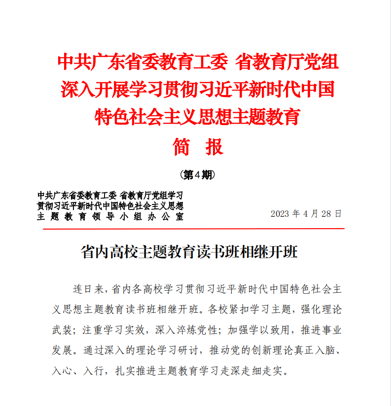 近日,中共广东省委教育工委、省教育厅党组《深入开展学习贯彻习近平新时代中国特色社会主义思想主题教育简报》第4期以“省内高校主题教育读书班相继开班”为题,介绍了省内高校开展主题教育读书班的好经验好做法。其中,我校主题教育读书班的特色做法获得刊发推介。