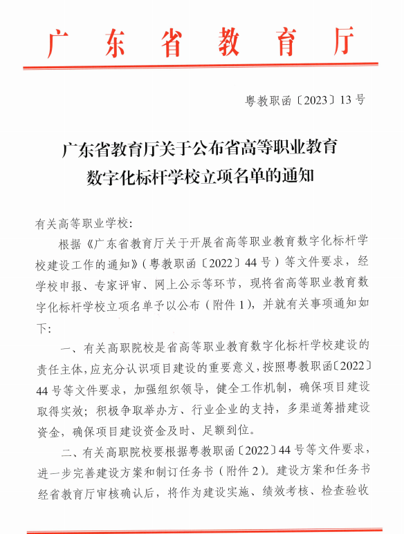 根据《广东省教育厅关于开展省高等职业教育数字化标杆学校建设工作的通知》(粤教职函〔2022〕44号)等文件要求,经过申报、资格审查、网络评审等环节,广东省教育厅近日公布了广东省高等职业教育数字化标杆学校建设单位,我校成功入选。