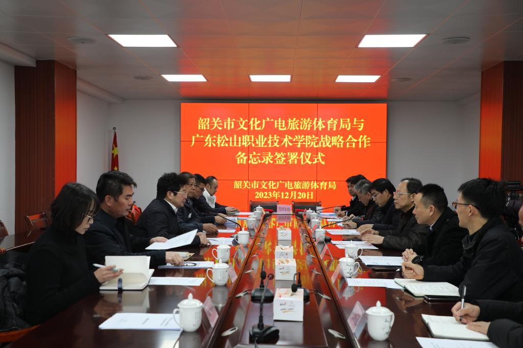 为深入贯彻落实《中共广东省委广东省人民政府关于新时代广东高质量发展的若干意见》文件精神和省委“1310”具体部署,搭建新时代产教融合新平台,助力韶关市经济社会高质量发展,12月20日上午,我校与韶关市文化广电旅游体育局(简称“市文旅局”)战略合作备忘录签订仪式在市文旅局会议室正式举行。学校校长吴奇峰、副校长张志,市文旅局局长黄宣剑、副局长朱伙新出席签署仪式。学校党政办公室、教务部、外语商务学院负责人以及市文旅局相关科室负责人参加了本次仪式。
