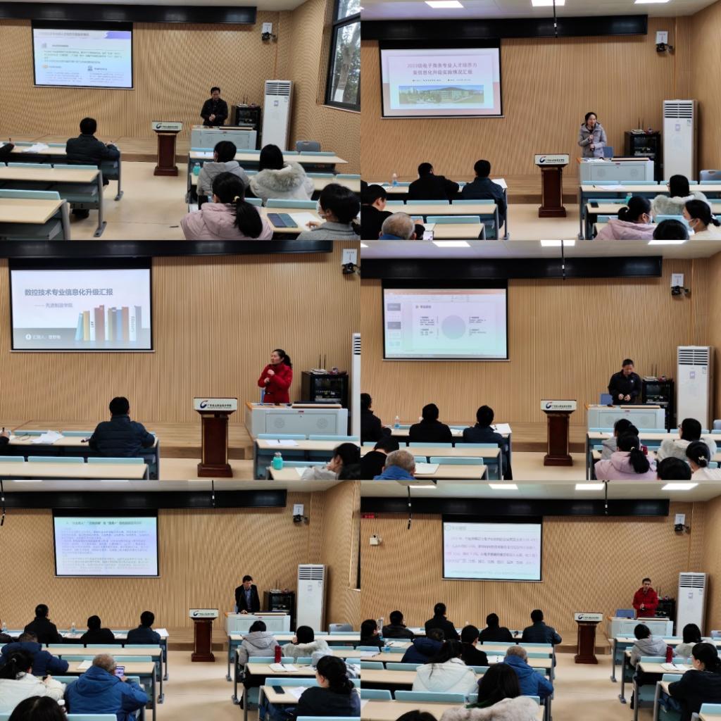 会上,大数据技术、数控技术、电子信息工程技术、商务英语、电子商务、建筑智能化工程技术专业负责人以专业人才培养方案信息化升级的具体举措、成效数据图表、案例为主,包含专业定位、人才培养目标、人才培养模式、课程体系、教学团队、教学资源建设、教学改革、特色与创新、专业诊改等多项内容依次进行汇报。