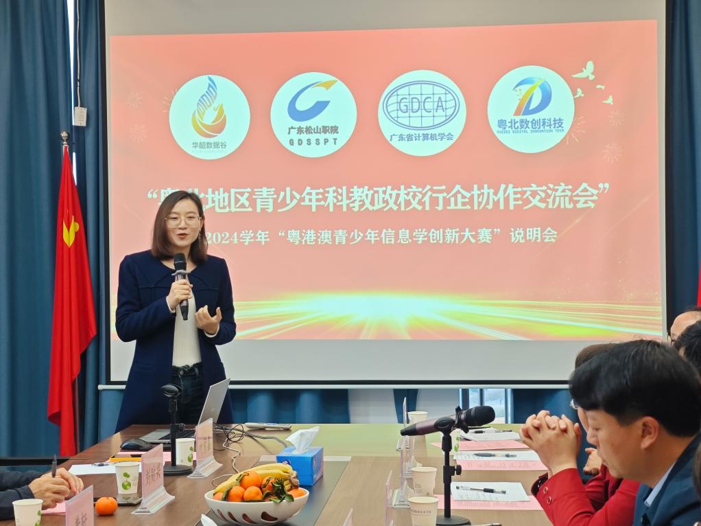 黄轩介绍了广东省信息学专业的招生情况及2024学年粤港澳青少年信息学创新大赛的基本情况。他表示,粤港澳青少年信息学创新大赛自首届举办以来,比赛得到了各界的广泛关注与支持,成为大湾区青少年学生展示自己科技创新成果的重要平台,希望能与韶关市教育局携手合作,共同推动大湾区科技创新与发展。