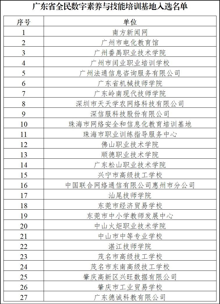本次活动由广东省委网信办、省教育厅、省工业和信息化厅、省人力资源和社会保障厅、省农业农村厅、省政务服务和数据管理局共同主办,经各地区初选推荐、专家评审、部门审核等环节,联合评选出作为“广东省全民数字素养与技能培训基地”的27家单位。