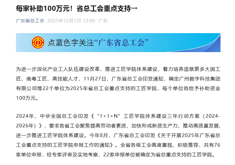 近日,广东省总工会公布了2025年重点支持工匠学院名单,广东松山职业技术学院工匠学院名列其中,是22家入选单位中仅有的三所职业院校之一。这也是继今年8月份被确定为韶关市总工会2025年重点支持的工匠学院(共8家)后,再获省总工会确定为重点支持工匠学院,将获得100万元专项补助资金。