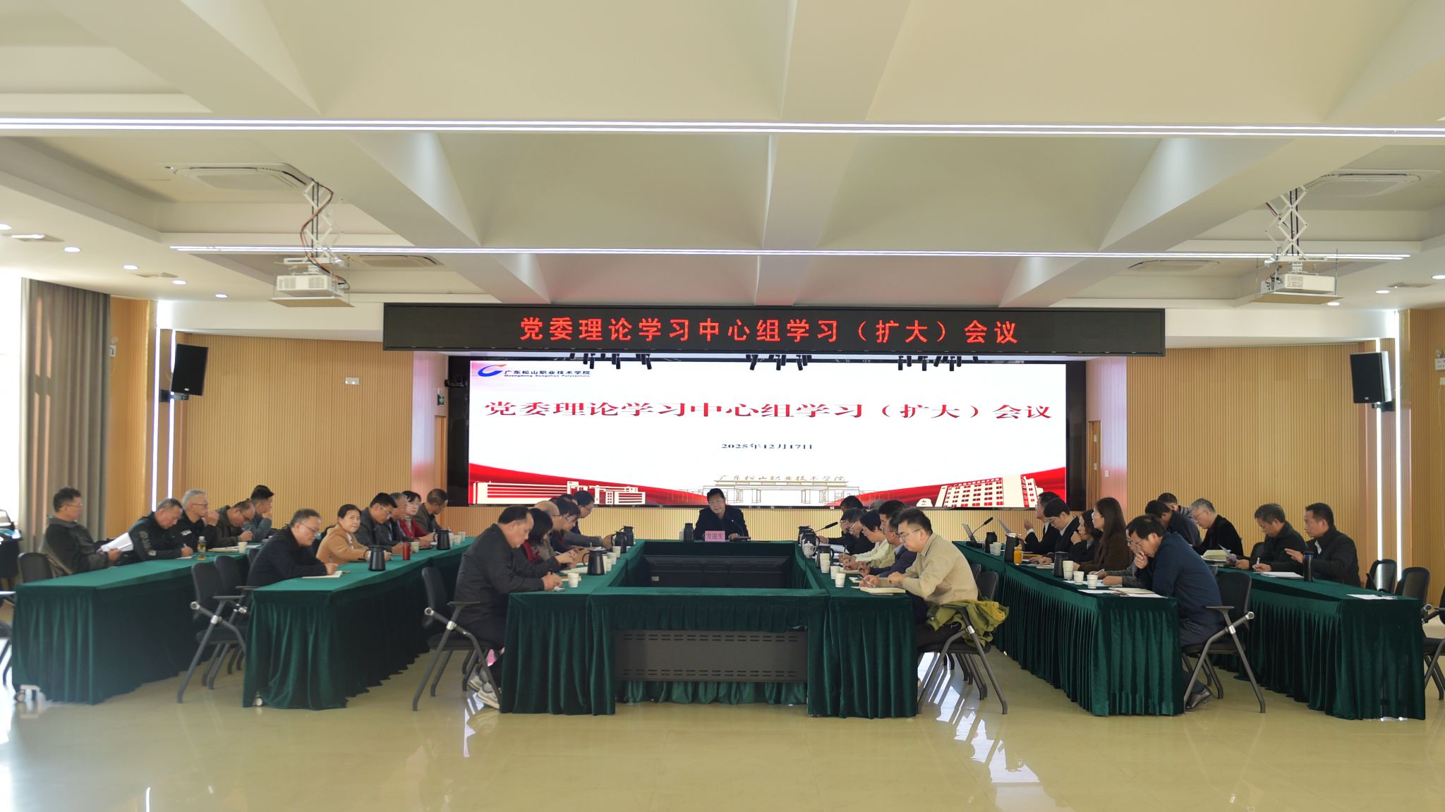 12月17日,学校在学术报告厅宽C201召开党委理论学习中心组学习(扩大)会议,党委书记方迎生主持会议并讲话,学校领导班子成员出席会议,学校职能部门和二级学院主要负责人参加会议。