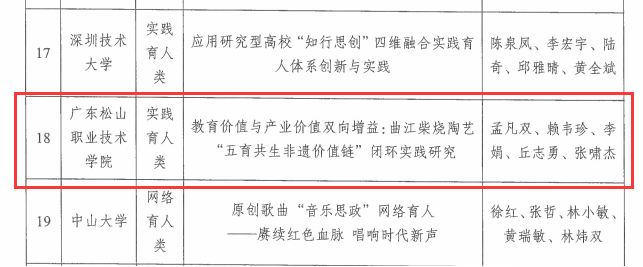 12月15日,团省委公布了广东高校共青团思政精品项目征集评选活动结果,我校作品《教育价值与产业价值双向增益:曲江柴烧陶艺“五育共生非遗价值链”闭环实践研究》(项目成员:孟凡双、赖韦珍、李娟、丘志勇、张啸杰)入围省级精品案例。