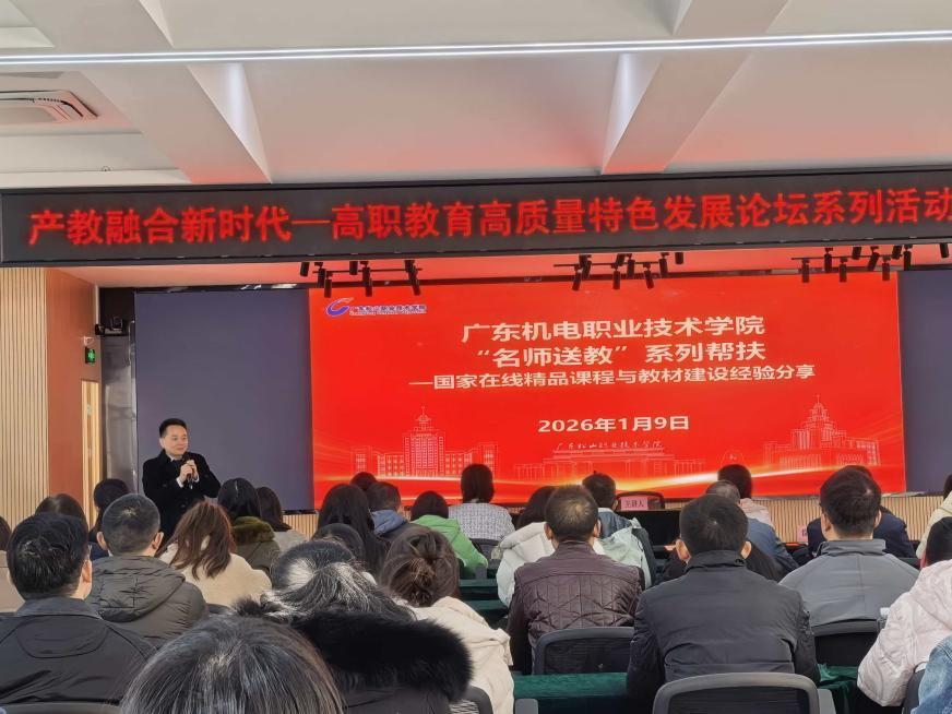 为提升课程及教材建设质量,持续推进“产教融合新时代——高职教育高质量特色发展论坛”系列活动,1月9日上午,学校邀请广东机电职业技术学院“名师送教”帮扶团队蔡晓红、陈捷、殷华、林丽琴、蒋彬莅临我校,为我校教师带来了国家在线精品课程与教材建设经验分享专题讲座。副校长张志出席并致辞,教务部副部长王影主持,各院系教师代表共100余人参加。